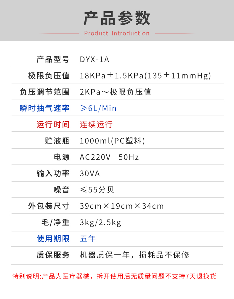 - 极限负压值:18KPa±1.5KPa(135mmHg±11mmHg)