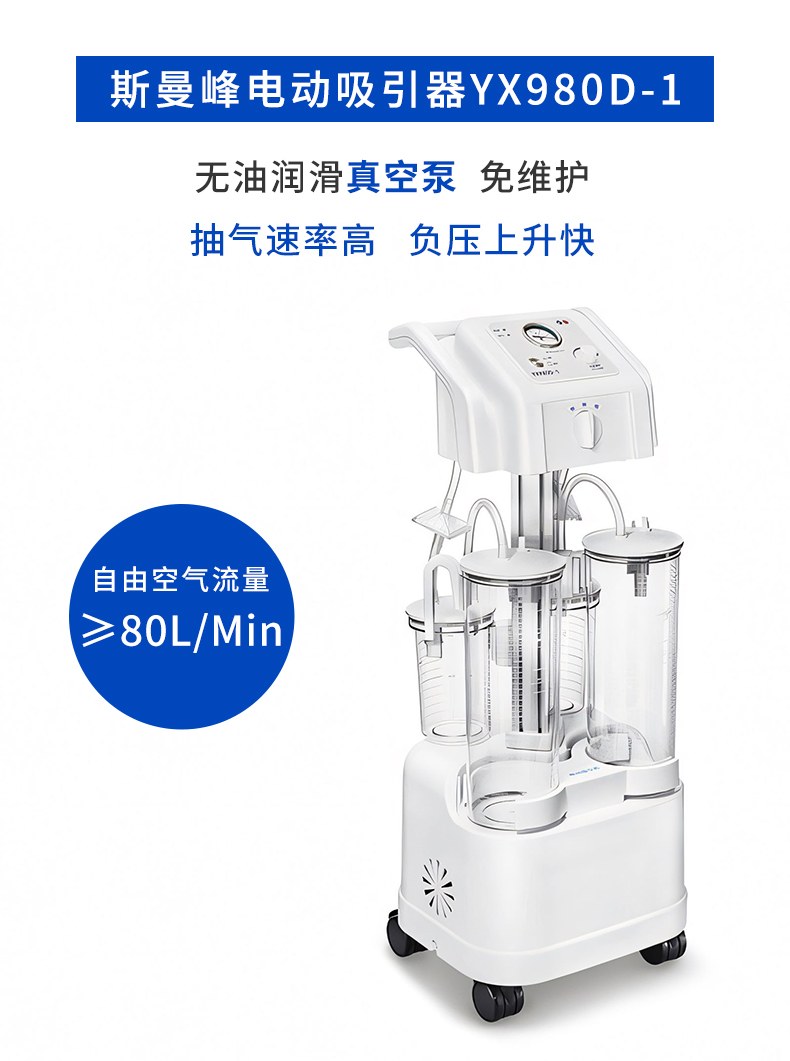 斯曼峰YX980D-1型电动吸引器是一种高负压、大流量的医用吸引装置。该产品适用于医疗机构吸出患者气道内分泌物,手术时吸除患者体内渗出液和冲洗液。不适用于流产吸引。