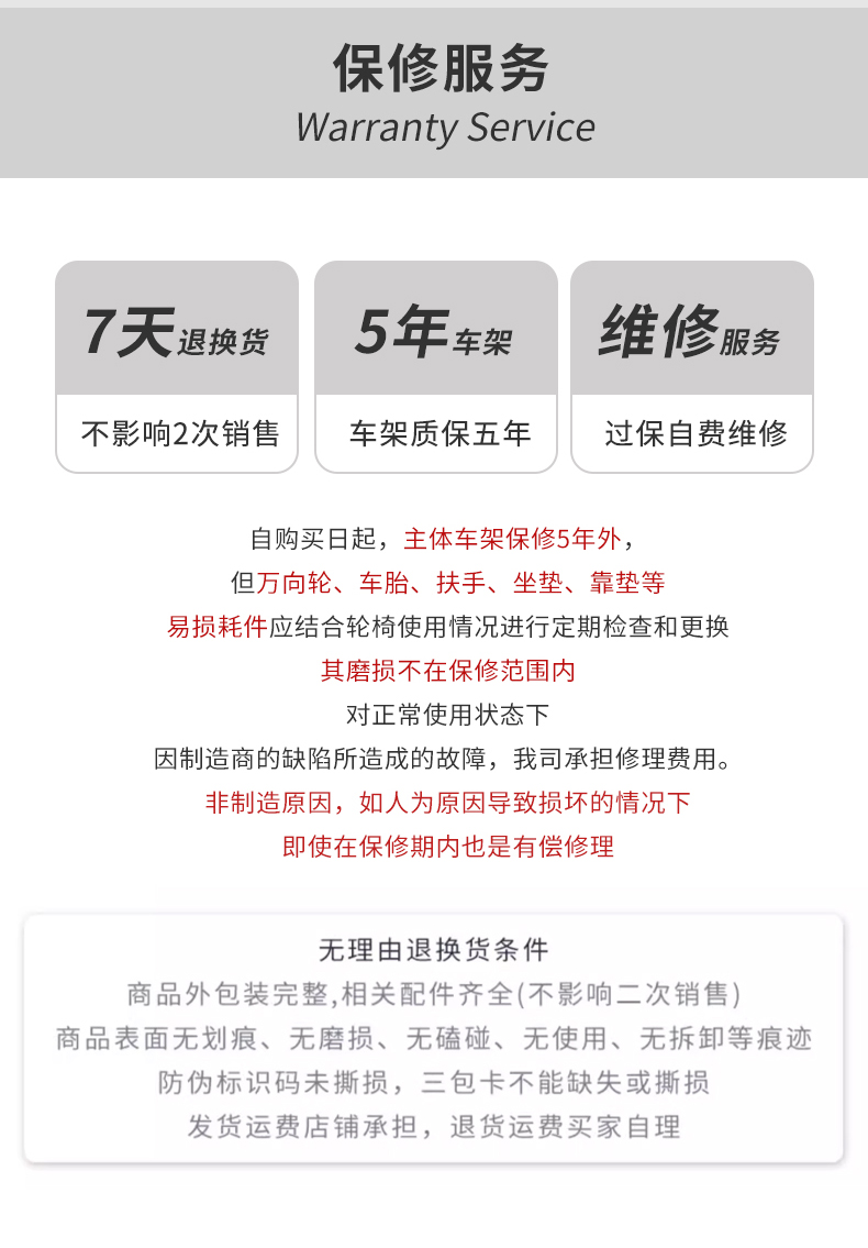 关于保修:自购买日起,除了本体车架保修5年外,其他部分保修1年。对正常使用状态下,因制造商的缺陷所造成的故障,我司承担修理费用。但万向轮、车胎、扶手、坐垫、靠垫等易损耗件应结合轮椅使用情况进行定期检查和更换,其磨损不在保修范围内。(非制造原因,如人为原因导致损坏的情况下,即使在保修期内也是有偿修理)